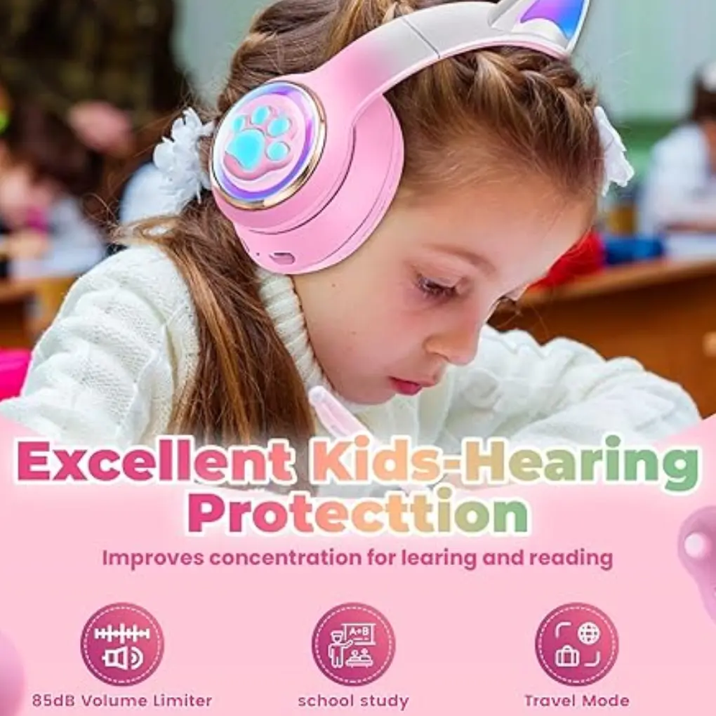 What sets these headphones apart is their eye-catching cat ear design, complete with LED lights that can be turned on or off depending on your child’s preference. Whether they’re listening at home, traveling, or attending virtual classes, these headphones make them feel special, stylish, and excited to wear their gear.