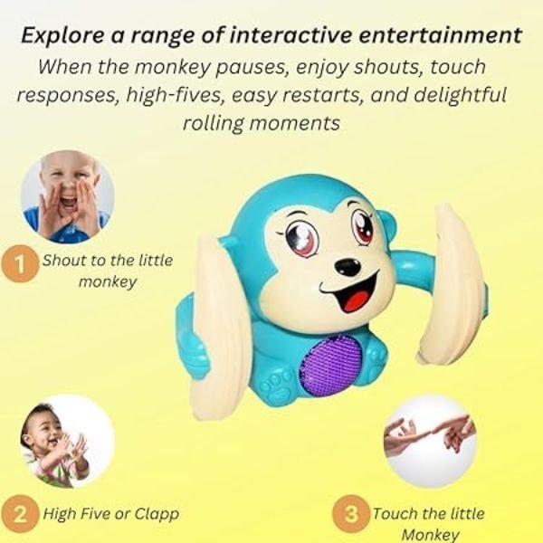 Best playtime with our Battery Operated Musical Tumbling Monkey Toy! Featuring Voice Control Sensor, Light, Music, and a Rotating Banana Arm