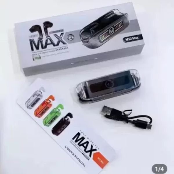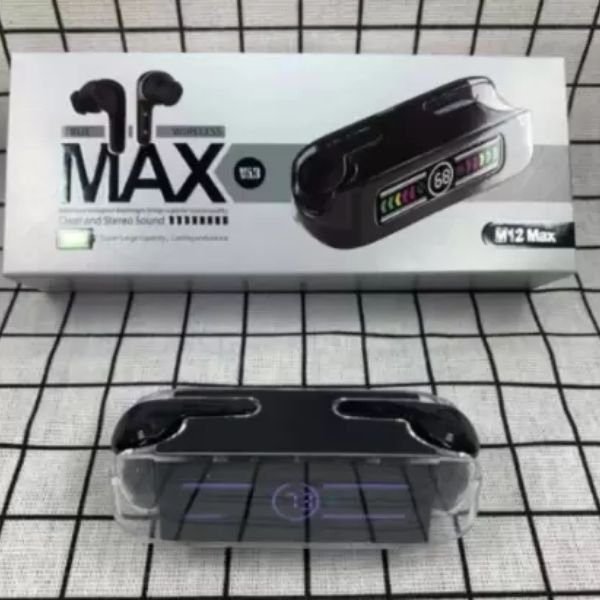 The M12 Max Compact Earbuds are also equipped with noise-canceling microphones, ensuring clear voice calls even in noisy environments. Whether you’re at home, commuting, or working out, these earbuds offer a seamless and high-quality audio experience M12 Max Compact Bluetooth Earbuds 9D Stereo.
