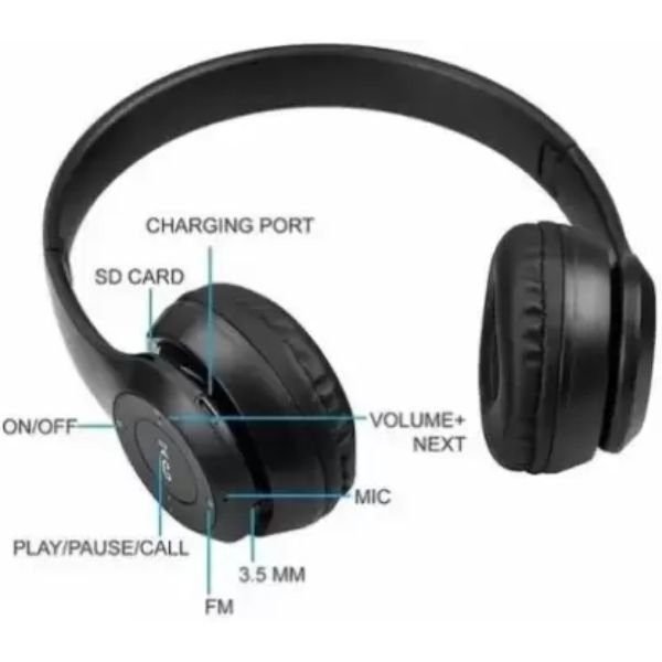 P47 WIRELESS HEADPHONE Aesthetic Design, Precise Sound Earphones with a user-friendly design and a life-like rhythmic reaction can be a great accessory for music enthusiasts. With an over-the-ear design, this headset lets you chat all day comfortably with cushioned, noise-cancellation ear. Durable Earphone With mic Tangle Free cables and Call Receive / Cut and Play / Pause Button (Change Track on Double and Triple Click) makes it easier to have long lasting, tangle and frustration free music and call experience. ommunicate and enjoy impressive entertainment audio in style.MP3 player(PLAY BY INSERTING TF CARD) and FM radio for convenient stand-alone use, AUX – a standard 3. 5 mm jack for a wired connection. These sweat resistant earphones are great for running and gym workouts. With an over-the-ear design, this headset lets you chat all day comfortably with cushioned, noise-cancellation ear. Over-ear & Adjustable headband Design: Adjust the headband for tight and comfortable wearing by yourse