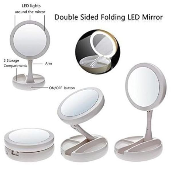 Tabletop Makeup MirrorThe Foldaway Mirror is a mirror that can be quickly folded out and used in any room of the house. It rests on its own stand and will also swivel and rotate. This mirror is double-sided, with one side giving you a realistic view of your face while the other side will show it at 10 times the size. What’s more, with the press of a button at the bottom of the stand, you can power up LED lights that will illuminate both sides. When you are finished, My Foldaway Mirror will collapse back down into the base for easy storage and transportation. When the mirror is extended there are |