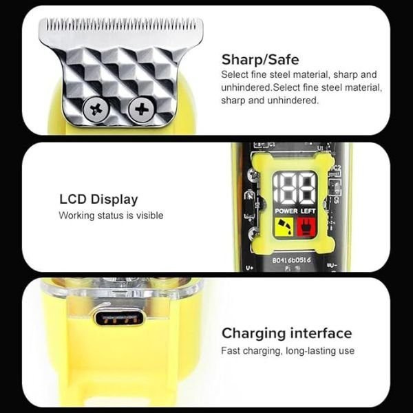 Reponic hair Trimmer is a professional-grade grooming tool designed to deliver precision and versatility for barbers and personal users alike. Featuring a T-blade design, this clipper allows for 0-gapped outlining, providing the perfect tool for sharp, detailed trims and shapes. It offers cordless operation, powered by a rechargeable Li-ion battery that provides up to 180 minutes of runtime on a full charge, making it ideal for extended grooming sessions. The digital display shows the battery status, so you can easily monitor power levels during use. The clipper comes with three adjustable guide combs (1mm, 2mm, and 3mm), which allow for a range of hair lengths and styles, from close fades to longer cuts. Powered by a rotary motor, it ensures efficient and smooth cutting through all hair types, providing a snag-free experience. Lightweight yet powerful, the clipper is ergonomic and easy to handle, allowing for comfortable use during long grooming sessions. With its bold yellow color and durable construction, the Reponic hair Trimmer is not only functional but also stylish. Whether you’re trimming beards, shaping heads, or tackling body hair, this clipper meets the demands of both professionals and home users, delivering reliable performance and long-lasting battery life for precision grooming.